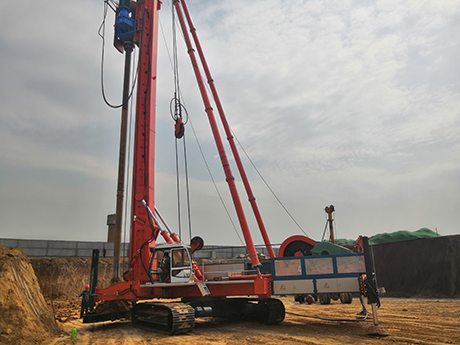 螺旋打樁機主要由頂部滑輪組、立柱、斜撐桿、底盤、行走機構、回轉機構、卷揚機構、操縱室、液壓系統及電氣系統組成。立柱為折疊式,采用箱形截面結構型式,法蘭連接方式。立柱兩側配有圓形或方形滑道作為動力頭、鉆桿上下運動的導向和抗扭。此種鉆機配備的箱形可折疊式立柱利用液壓缸進行起降,方便快捷,運輸時也不需拆卸。立柱下部與上盤鉸接,中后部與斜撐桿鉸接,立柱頂部有滑輪組,用來完成對動力頭、鋼筋籠和注漿導管等的起降。動力頭沿滑道上下滑動托運時可拆卸。